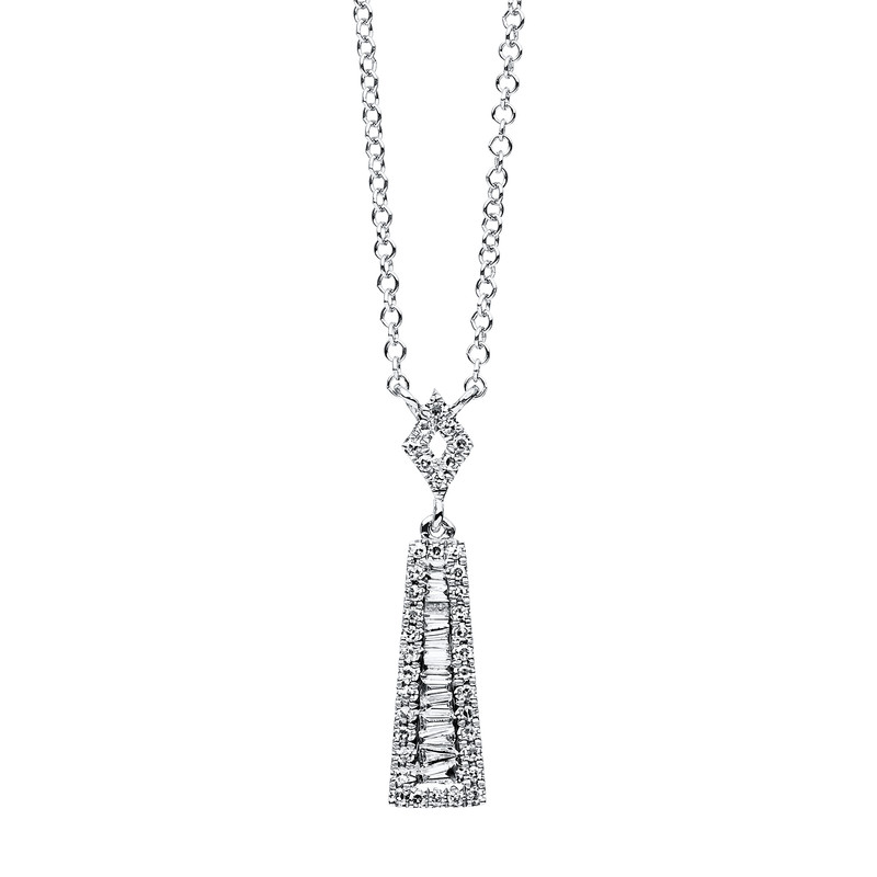 necklace 14 kt WG, 14 tapers 0,13 ct, G-si, 38 diamonds 0,09 ct, H-si, h:20,0 mm, w:5,0 mm, l:46,0 cm
