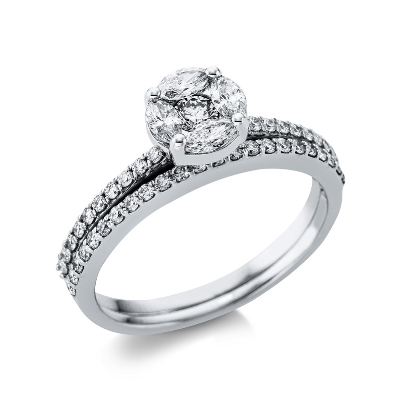 ring 18 kt WG, 4 marquise 0,29 ct, G-vsi, 44 diamonds 0,40 ct, G-vsi, width:53